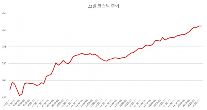 22일 코스닥은 전거래일대비 20.88포인트(2.82%) 오른 761.20으로 마감했다. 코스닥은 이날 1.83포인트(0.25%) 오른 742.15로 출발했다. 오전 중 잠시 흔들리기도 했으나 이후 꾸준히 상승폭을 키우며 760선에서 장을 마쳤다.