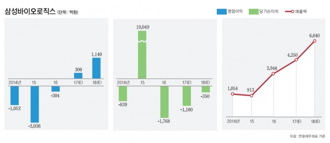 삼성바이오로직스는 아직 제대로 흑자를 내지 못하고 있는 회사다. 컨센서스 기준으로 지난해 별도 영업이익은 흑자전환(372억원), 당기순이익(-930억원)은 적자 지속이 예상된다. 별도 기준으로는 올해가 흑자전환의 원년(당기순이익 1276억원)이 될 전망이다.