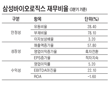 지난해 3분기 말 기준으로 삼성바이오로직스의 재무비율을 살펴보면 아직까지는 불안한 구석이 많다.