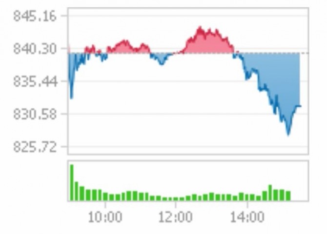 이미지 확대보기9일 코스닥은 전 거래일 대비 9.52포인트(1.13%) 내린 829.99으로 마감했다. 장 초반 코스닥은 840선을 돌파한 841.39로 상승 출발했다. 오전 9시 3분 부터 838.99로 하락 전환한 후 등락을 반복했다.