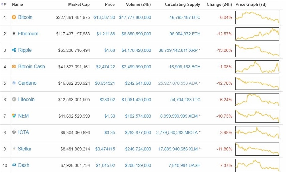 이날 코인마켓캡에 따르면 오후 2시 30분 기준 상위 10개 가상화폐 종목들이 일제히 급락중이다. 3대 가상화폐인 비트코인, 이더리움, 리플은 각각 전거래일대비 6.04%, 12.57%, 13.06% 내리고 있다.