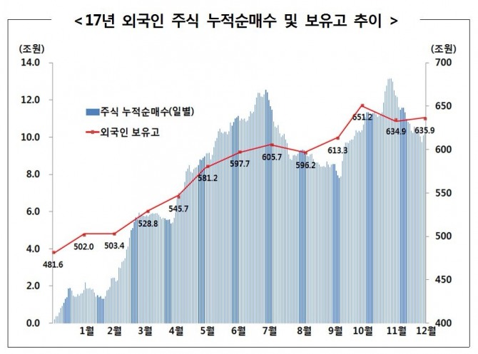 금융감독원은 15일 '2017년 외국인 증권 투자 동향'을 통해 지난해 외국인이 국내 상장 주식 10조2000억원을 순매수했다고 밝혔다. 2016년(순매수 12조1000억원)에 이어 2년 연속 10조원을 넘어선 것이다.
