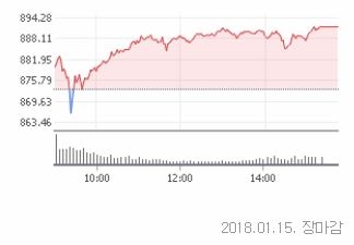 이미지 확대보기15일 코스닥은 전 거래일 대비 18.56포인트(2.13%)오른 891.61로 상승 마감했다. 코스닥 종가가 890선을 넘은 건 2002년 3월 27일 이후 16년 여만에 처음이다.