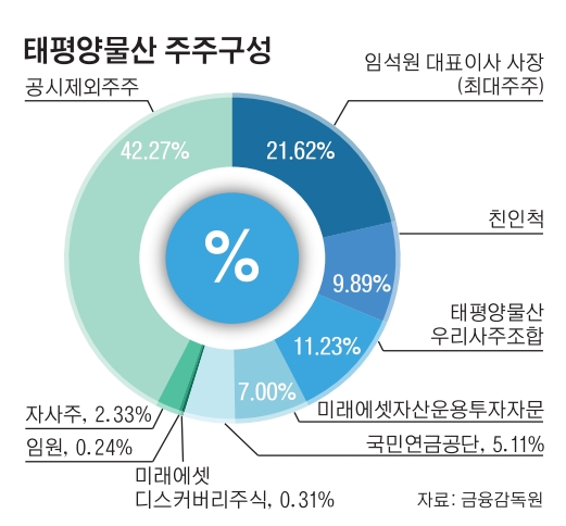 임 사장의 지분율은 21.62%다. 이외 친인척이 9.89%를 보유하고 있다. 태평양물산 우리사주조합도 11.23%를 보유 중이다. 미래에셋자산운용투자자문과 국민연금공단이 각각 7%, 5.11%를 보유 중이다.
