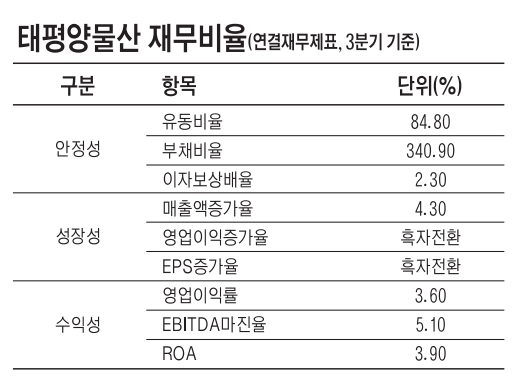 이 회사의 지불능력을 판단하는 지표인 유동비율(이하 연결 기준)은 3분기 말 기준 84.8%다. 3분기 말 기준으로 태평양물산의 유동자산은 3530억원, 유동부채는 4165억원이다. 유동비율은 통상 200% 이상으로 유지되는 것이 이상적이라 본다. 수치의 절반도 되지 못한다.