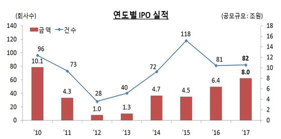 이미지 확대보기금융감독원은 지난해 IPO 시장에 총 82개사가 신규상장했다고 29일 밝혔다. 공모금액은 7조9742억원으로 8조원에 육박하는 것으로 집계됐다. 이는 지난 2010년 10조1000억원을 기록한 이후 최대 규모다.