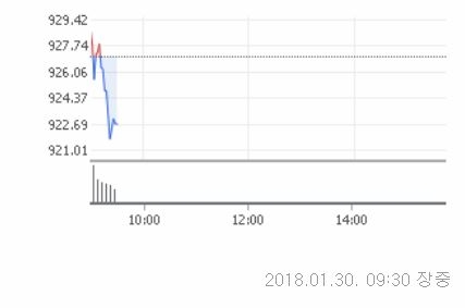 30일 오전 9시 30분 현재 코스닥은 전거래일대비 385포인트(0.42%)내린 923.20에 거래중이다.