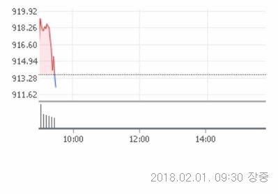 1일 오전 9시 30분 현재 코스닥은 전거래일대비 0.49포인트(0.05%) 내린 913.08에 거래중이다. 이날 코스닥은 전일 대비 3.21포인트(0.35%)오른 916.78로 상승 출발했지만 외국인의 매도세에 이내 하락세로 돌아섰다.