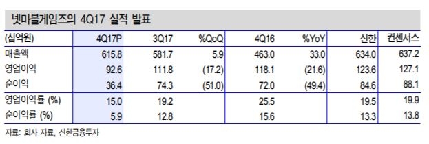 이문종 연구원은 "지난해 4분기 매출액과 영업이익은 각각 6158억원과 926억원으로 시장 예상치를 하회했다"며 "리니지2레볼루션 매출은 약 2394억원으로 추정된다"고 밝혔다.
