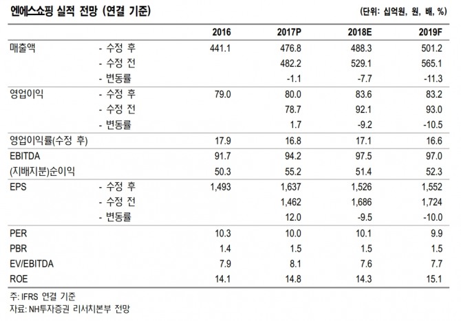 이지영 NH투자증권 연구원은 "엔에스쇼핑의 올해 실적(별도 기준)을 취급고 1조4270억원(전년대비 +4%), 영업이익 996억원(+5%)로 추정한다"며 "올 한해도 송출수수료 인상률이 12%에 이를 것으로 예상되어 만만치 않은 한 해 될 것"이라고 밝혔다.