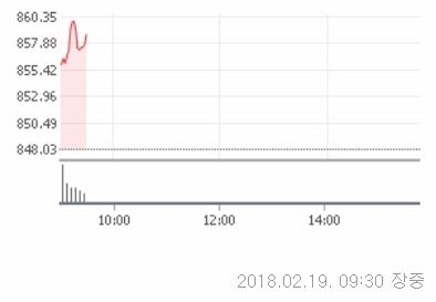 19일 오전 9시 30분 현재 코스닥은 전거래일대비 10.96포인트(1.29%)오른 858.99로 거래중이다.
