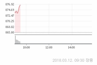 12일 오전 9시30분 현재 코스닥은 전거래일대비 10.99포인트(1.27%)오른 876.79에 거래중이다. 전체 거래량은 1억7329만주를 기록중이다.