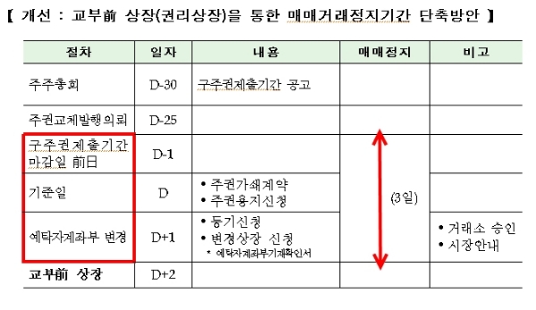 개선안에 따르면 주식분할 등의 경우 투자자 환금성 제약을 최소화할 수 있도록 주권교부 이전상장을 원칙으로 전환하여 매매거래정지기간을 단축이 핵심이다.