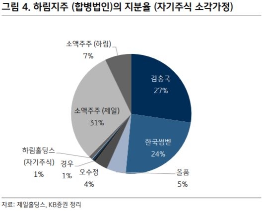 특히 제일홀딩스의 주가수익비율(PER)은 5.7배 , 주가순자산비율(PBR)은 0.79배로 하림홀딩스(PER 10.5배, PBR 0.86배) 대비 저평가 받고 있다. 향후 합병이 추진되는 과정에서 주가가 수렴할 것으로 내다봤다.