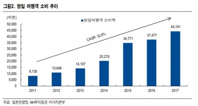아울러 "같은 기간 여행객의 소비지출 성장률 또한 32.6%로 높은 편"이라면서 "발달된 기념품 문화를 바탕으로 여행경비 중 쇼핑 지출 비중이 37.1%에 달하는 등 면세업에 투자매력이 높다"고 평가했다.
