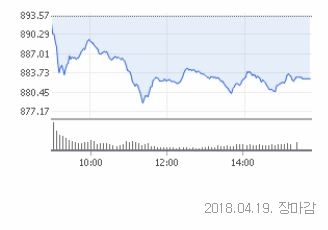 19일 코스닥은 전거래일대비 10.59포인트(1.19%)내린 882.73으로 장을 마쳤다. 코스닥 지수는 이날 전일대비 1.12포인트(0.13%)내린 892.20으로 장을 출발했다. 개인의 매도 확대로 장중 하락세를 이어갔다.