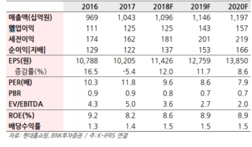 이승은 BNK투자증권 연구원은 “목표주가는 2018~2019F 평균 EPS에 유통업 평균 PER 11.6배를 적용했으며 현재 12M FWD PER은 9.2배로 거래되고 있다”며 “2018년 1분기 현재 동사 현금보유금액은 8083억원으로 순현금 가치만으로도 이미 시가총액의 61%를 차지하고 있어, 주가 추가상승 매력도가 높아질 것으로 예상된다”고 말했다.