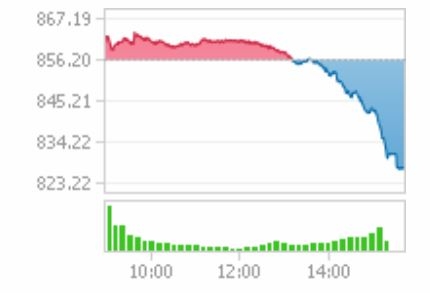 8일 코스닥은 전거래일대비 29.12포인트(3.40%)내린 827.22로 장을 마쳤다. 코스닥 지수는 이날 전거래일대비 4.22포인트(0.49%)오른 860.56으로 장을 출발한 뒤 장초반 외국인의 매수세에 힘입어 강세를 보였다. 그러나 오후들어 외국인과 기관이 동반 매도를 강화하며 반락했다. 장중 변동폭이 4%에 육박했다.