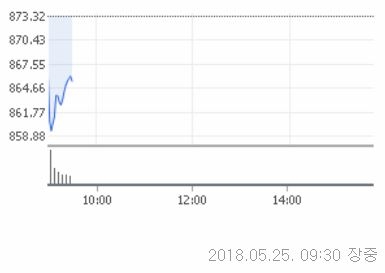 25일 오전 9시30분 현재 코스닥은 전거래일대비 6.80포인트(0.76%)내린 866.62에 거래중이다. 거래량은 3억665만주를 기록중이다.