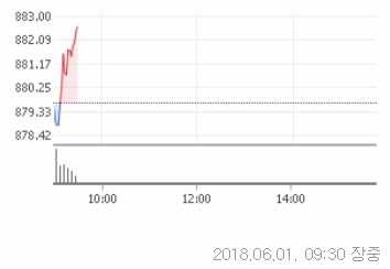 1일 오전 9시 28분 현재 코스닥은 전거래일대비 2.83포인트(0.32%)오른 882.49을 기록중이다. 코스닥 지수는 이날 전일대비 0.05포인트(0.01%)내린 879.61로 장을 출발했지만 외국인의 매수강화에 반등했다.