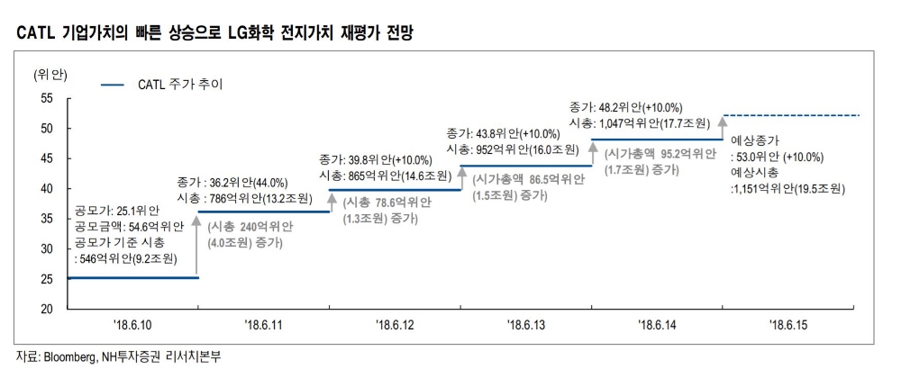 황유식 연구원은 "중국 최대 2차전지 기업 CATL은 11일 심천거래소 상장 후 전일까지 4일 연속 상한가를 기록했다"며 "공모가 기준 시가총액 9조2000억원에서 14일 현재 17조7000억원까지 상승했다"고 설명했다.