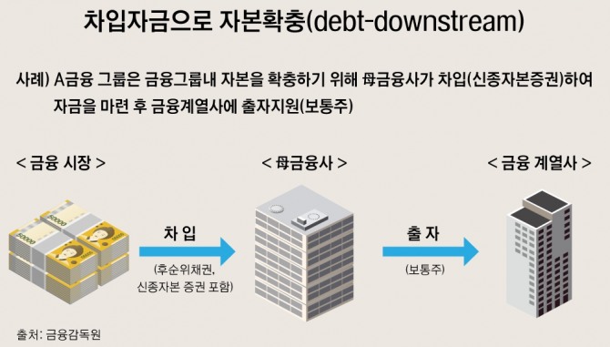 차입자금으로 자본확충하는 리스크도 지적했다. 미래에셋 그룹 지주회사 격인 미래에셋캐피탈은 채권발행 등으로 조달한 자금으로 계열사 주식을 확보하고 있다. 모회사가 후순위채권이나 신종자본증권 등 과도한 차입으로 계열사에 출자를 하다보면 자본의 질이 떨어진다. 향후 자회사에 무리한 배당을 요구할 수 있고 그룹 레버리지가 커질 우려도 배제할 수 없다는 평가다.