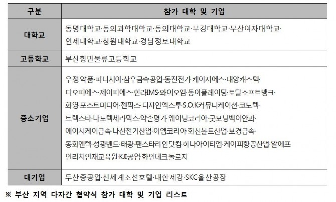 이번 다자간 협약식에는 부산 동명대·동의대 등 8개 대학과 부산항만물류고 등 1개 고등학교, 두산중공업·신세계조선호텔 등 4개 대기업, IBK베스트챔피언 기업인 우정약품 등 38개 중소기업 관계자 등 총 70여 명이 참석했다.