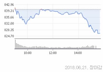 21일 코스닥은 전거래일대비 13.95포인트(1.66%)내린 826.22로 장을 마쳤다. 코스닥 지수는 이날 전일대비 1.27포인트(%)오른 841.44로 장을 출발했다. 장중 외국인과 기관이 팔자 태세로 전환하면서 지수를 끌어내렸다.