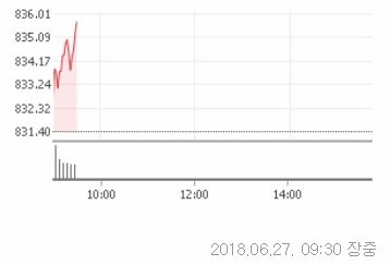27일 오전 9시 30분 현재 코스닥은 전거래일대비 3.71포인트(0.45%)오른 835.17에 거래중이다.