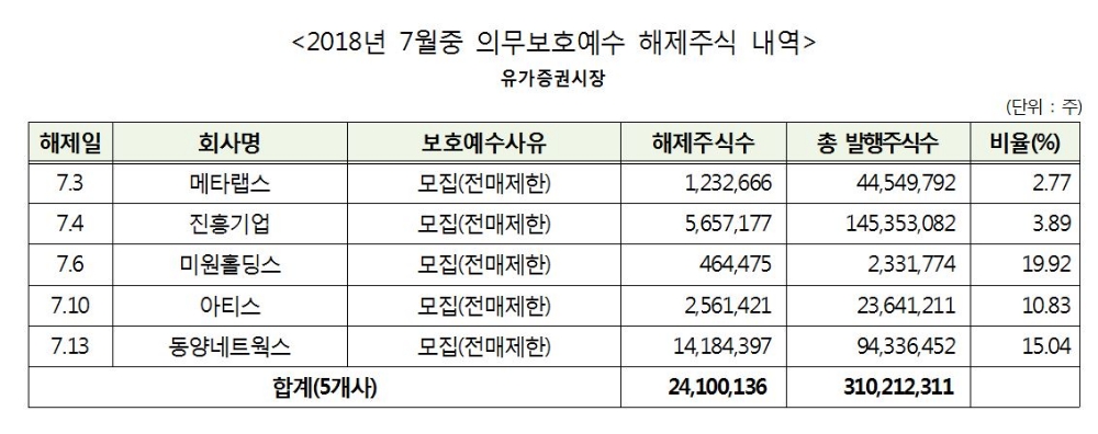 7월 중 해제되는 주식 물량은 6월(2억8363만주)보다 53.7% 적고 전년동기(1억7687만주)보다는 25.8% 감소한 수준이다.