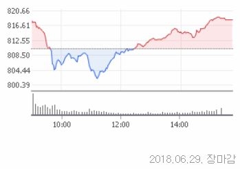 29일 코스닥은 전거래일대비 8.02포인트(0.99%)오른 818.22로 장을 마쳤다. 코스닥 지수는 이날 전일대비 7포인트(0.86%)오른 817.20으로 장을 출발했다. 장초반 하락세를 보이기도 했지만 오후들어 외국인과 기관의 매수세가 유입되면서 반등했다.