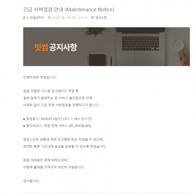 DB 교체 작업 이후 오전 9시에 서버 점검을 마쳤으나 이후 장애가 발생해 원화 입출금 서비스를 중지했다는 것이다.