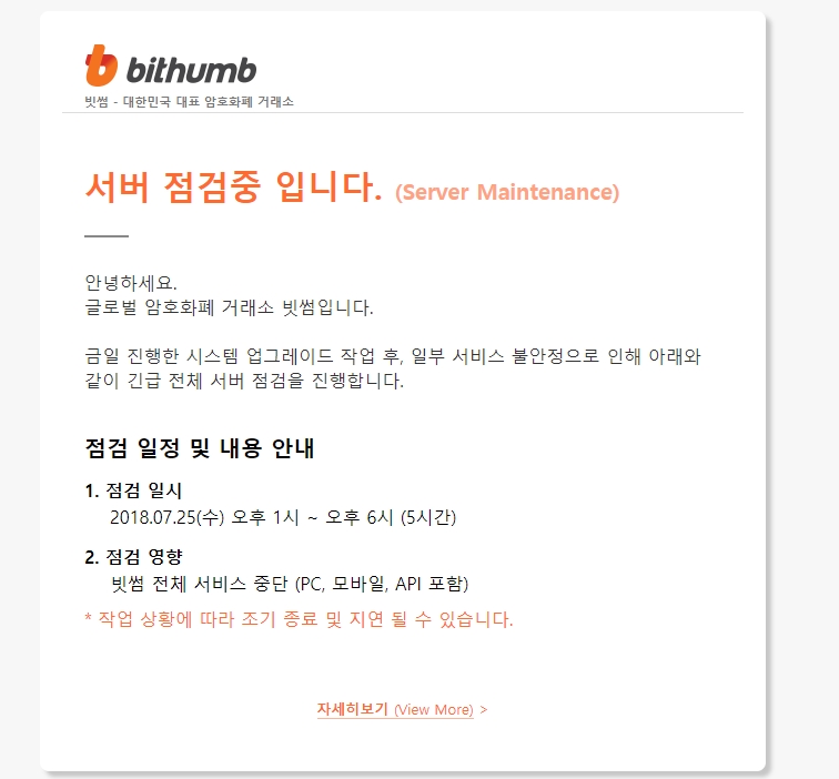빗썸은 이에따라 모든 거래를 중단 한 채 서버점검 작업에 들어갔다.