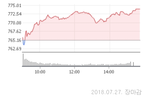 27일 코스닥은 전거래일대비 8.83포인트(1.15%)오른 773.98로 장을 마쳤다. 코스닥 지수는 이날 전일대비 0.88포인트(0.12%)오른 766.03으로 장을 출발했다.