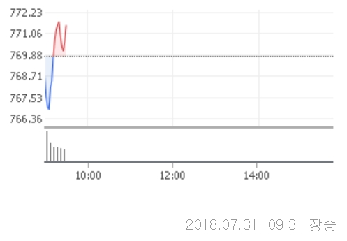 31일 오전 9시 31분 현재 코스닥은 전거래일대비 2.05포인트(0.27%)오른 771.85에 거래중이다.
