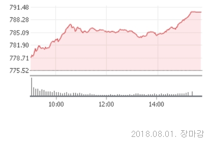 1일 코스닥은 전거래일대비 14.73포인트(1.90%)오른 790.25로 장을 마쳤다. 코스닥은 이날 전일대비 3.48포인트(0.45%)오른 779.00으로 장을 출발했다. 장중 외국인과 기관이 매수세로 전환하면서 지수를 끌어올렸다.