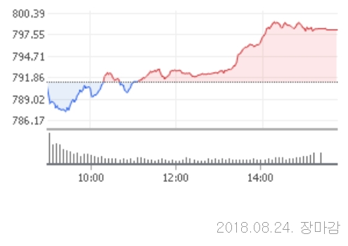 코스닥 지수는 이날 전일대비 0.52포인트(0.07%)내린 790.76으로 장을 출발했다. 장초반 지수는 약보합세를 보였지만 장중 외국인과 기관의 매수세가 유입되면서 지수가 1%가량 반등해 상승 마감했다.