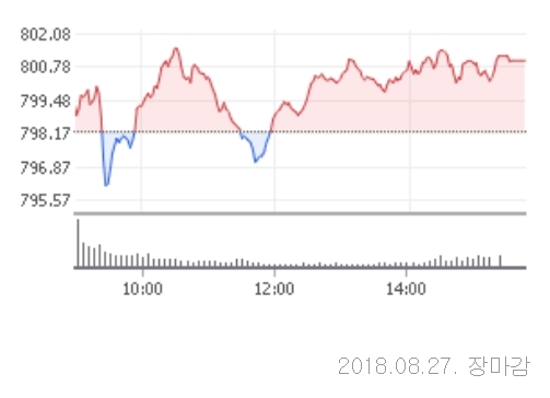 27일 코스닥은 전거래일대비 2.81포인트(0.35%)오른 801.04로 장을 마쳤다. 코스닥은 이날 전일대비 1.06 포인트(0.13%)오른 799.29로 장을 출발했다. 장중 보합권에서 등락을 거듭하다가 오후 들어 외국인과 기관의 매수세가 강화되면서 800선을 아슬아슬하게 넘겼다.
