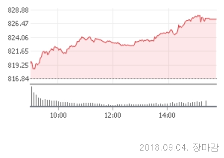 4일 코스닥은 전거래일 대비 10.43포인트(1.28%)오른 827.27로 장을 출발했다. 코스닥 지수는 이날 전일대비 2.5포인트(0.31%)오른 819.34로 장을 출발했다. 장중 외국인과 기관 투자자들이 매수세를 늘리면서 지수를 끌어올렸다.