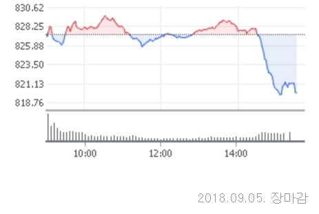 5일 코스닥은 전거래일대비 7.27포인트(0.88%)내린 820.00으로 장을 마쳤다. 코스닥 지수는 이날 전일대비 0.45포인트(0.05%)오른 827.72로 장을 출발했다. 장중 외국인과 기관이 매도세를 강화하면서 지수를 끌어내렸다.