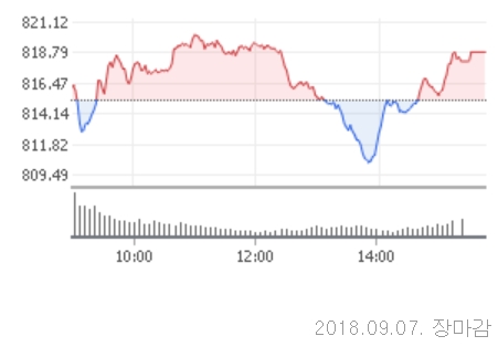 7일 코스닥은 전거래일대비 3.68포인트(0.45%)오른 818.86로 장을 마쳤다. 코스닥 지수는 이날 전일대비 0.91포인트(0.11%)오른 816.09로 장을 출발했다.