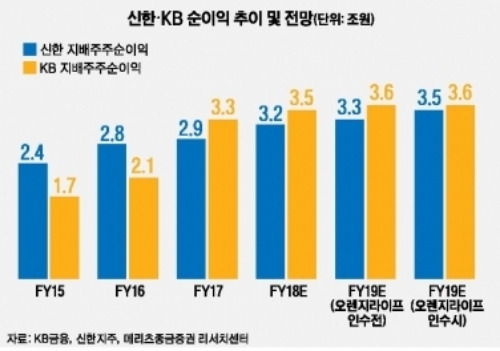 원재웅 NH투자증권 연구원은 “지난 2017년부터 KB금융과 신한지주는 연간 약 3000억원 이상 순익 차가 발생하고 있다”며 “ING생명을 인수하면 자금조달 비용을 제외시 약 2000억원의 순익 증가 효과가 발생하며 순익 격차가 1000억원 수준으로 좁혀진다”며 “약 1000억원의 순익은 은행과 자회사 간 효율화로 충분히 극복할 수 있는 수준이라고 판단된다”고 말했다.