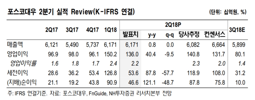 포스코대우의 2분기 실적은 매출액 6조1711억원, 영업이익 1360억원으로 시장 컨센서스를 충족했다. 미얀마가스전은 6월 10일 중국측 육상 가스관 폭발사고에도 불구, 이전까지의 판매량 강세 덕분에(일 4.6억 입방피트) 영업이익 777억원을 시현했다.