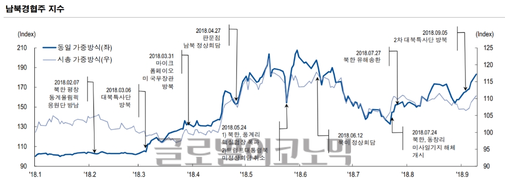 남북경협주는 9월 초 한국의 대북 특사단 파견으로 모멘텀이 재강화됐다. 올해 김정은 위원장의 신년사 발표 후 5월말까지 상승했지만, 북미 정상회담 취소 해프닝 등으로 변동성이 확대됐다. 북한 미사일 기지 해제 당시엔 지수가 바닥을 형성하기도 했다.