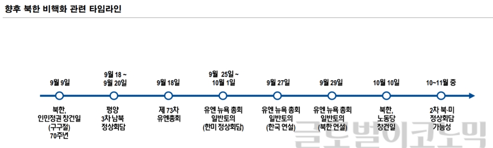 북한전략 전문가들은 남북경협이 본격화되려면 단순 교류나 회담이 아닌, '비핵화'와 '종전선언' 등 새로운 모멘텀이 등장해야 한다고 본다. 다만 10월 북미정상회담, 유엔총회 등 이벤트들이 잇달아 예정돼 북한 개방 관련주 모멘텀은 지속될 것으로 전망했다.