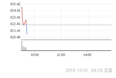 1일 오전 9시 26분 현재 코스닥은 전거래일대비 1.45포인트(0.18%)내린 820.82에 거래중이다.