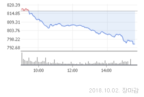 2일 코스닥은 전거래일대비 21.54포인트(2.64%)내린 794.99로 장을 마쳤다. 코스닥 지수는 이날 전일대비 0.86포인트(0.11%)오른 817.39로 장을 출발했다. 장중 외국인과 기관이 매도를 강화하면서 지수를 끌어내렸다.
