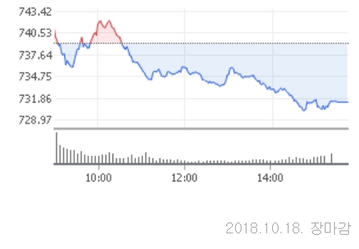 18일 코스닥은 전거래일대비 7.81포인트(1.06%)내린 731.34로 장을 마쳤다. 코스닥 지수는 이날 전일대비 2.06포인트(0.28%)오른 741.21로 상승 출발했다. 장중 외국인과 기관이 매도세를 강화하면서 지수를 끌어내렸다.