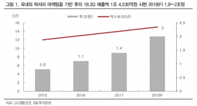 특히 IBK투자증권은 LG생활건강이 화장품 사업에서 최고 성과를 올릴 것으로 내다봤다. 화장품은 후가 2조원에 가까운 매출액 시현으로 글로벌 10대 브랜드에 진입하며 중국을 중심으로 럭셔리 고성장을 주도할 것으로 기대된다는 분석이다.