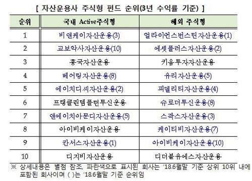 3년 수익률 기준으로 국내 액티브 주식형 부문에서는 BNK자산운용이 1위였고 교보악사자산운용, 흥국자산운용, 베어링자산운용, 에이치디씨자산운용 등이 뒤를 이었다.